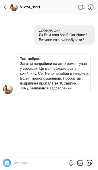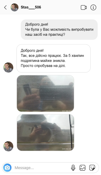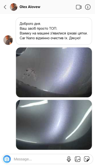 Миттєво видаляє будь-які подряпини, сколи від каміння, іржу (спричинену окисленням), водяні плями, вицвітання УФ-світла та будь-які забруднення.